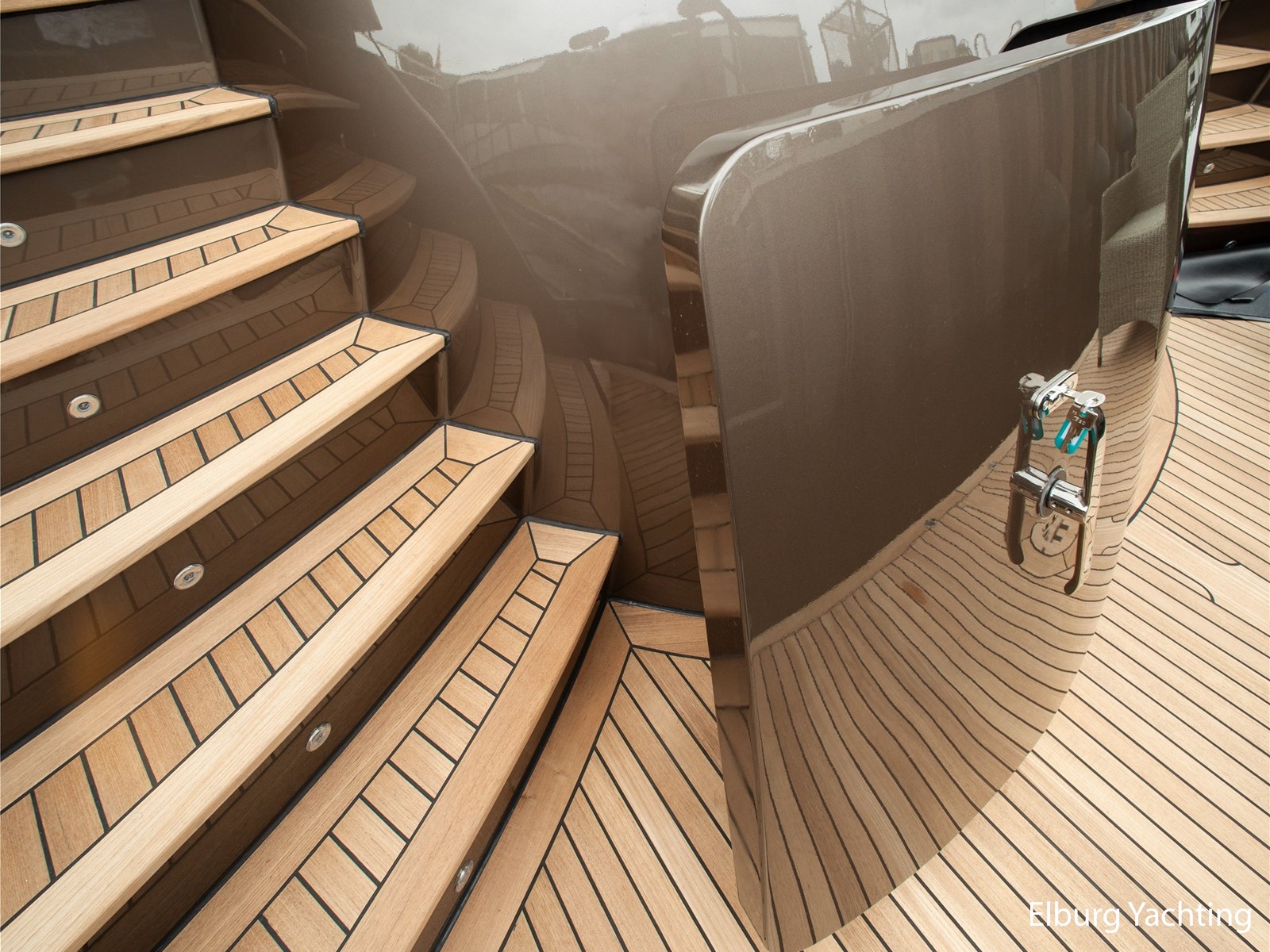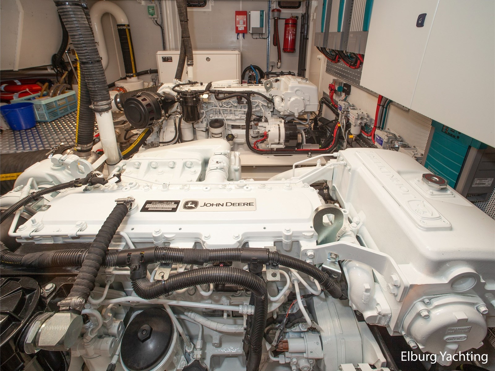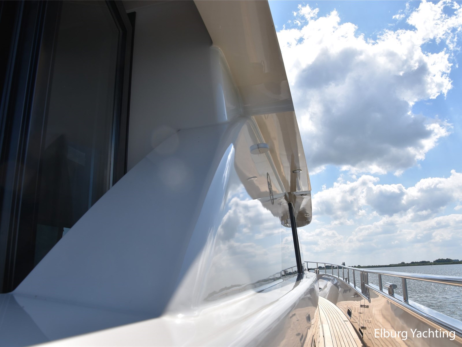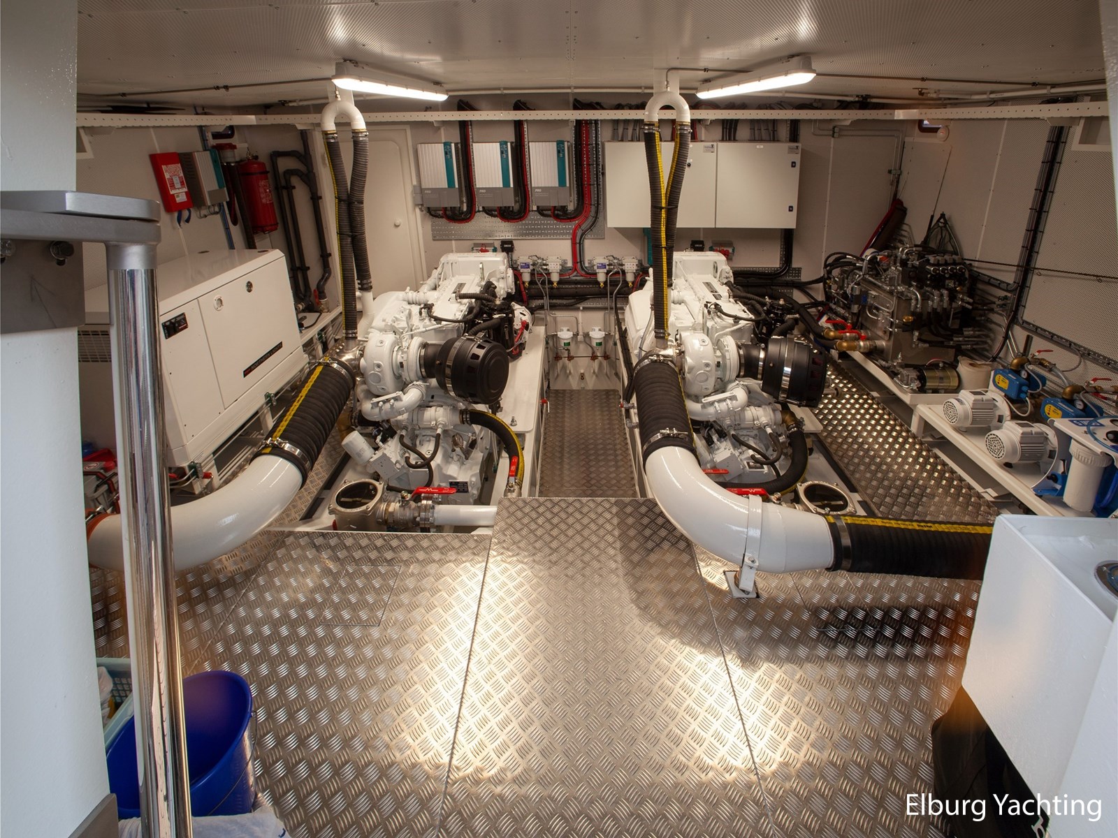 The deck-level saloon offers spectacular 360-degree views, enhancing the sense of space and light through the large windows. Wide sidedecks all around make it safe and easy to move around on a single level. The foredeck offers ample space for lounging, complete with a comfortable sofa for enjoying the view. The aft deck is also generously sized, with a semi-circular sofa for five people and a covered area providing shade on sunny days. Stylish stairs on both sides of the yacht lead to the spacious bathing platform, which also provides access to the professionally equipped engine room with good headroom. You'll enjoy a daily inspection here and see at one glance that all the technology is in working order. This vessel holds a valid CVO certificate.