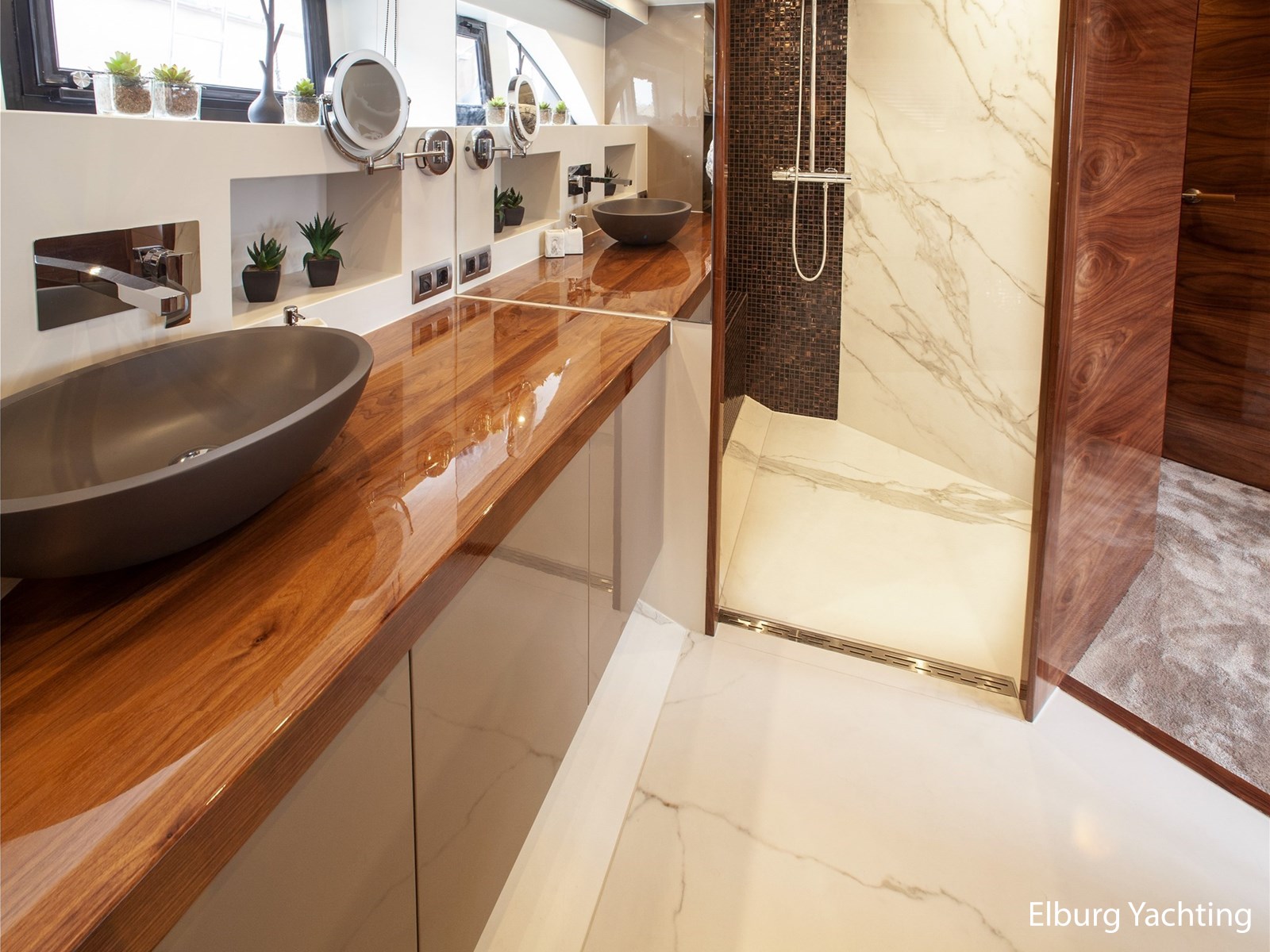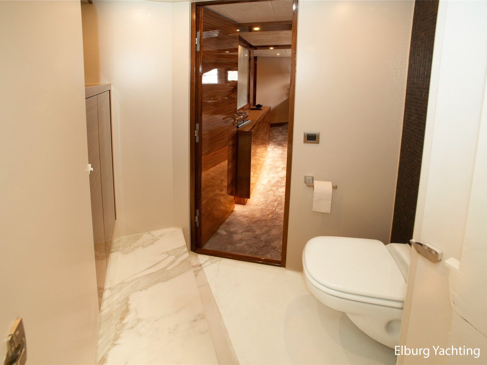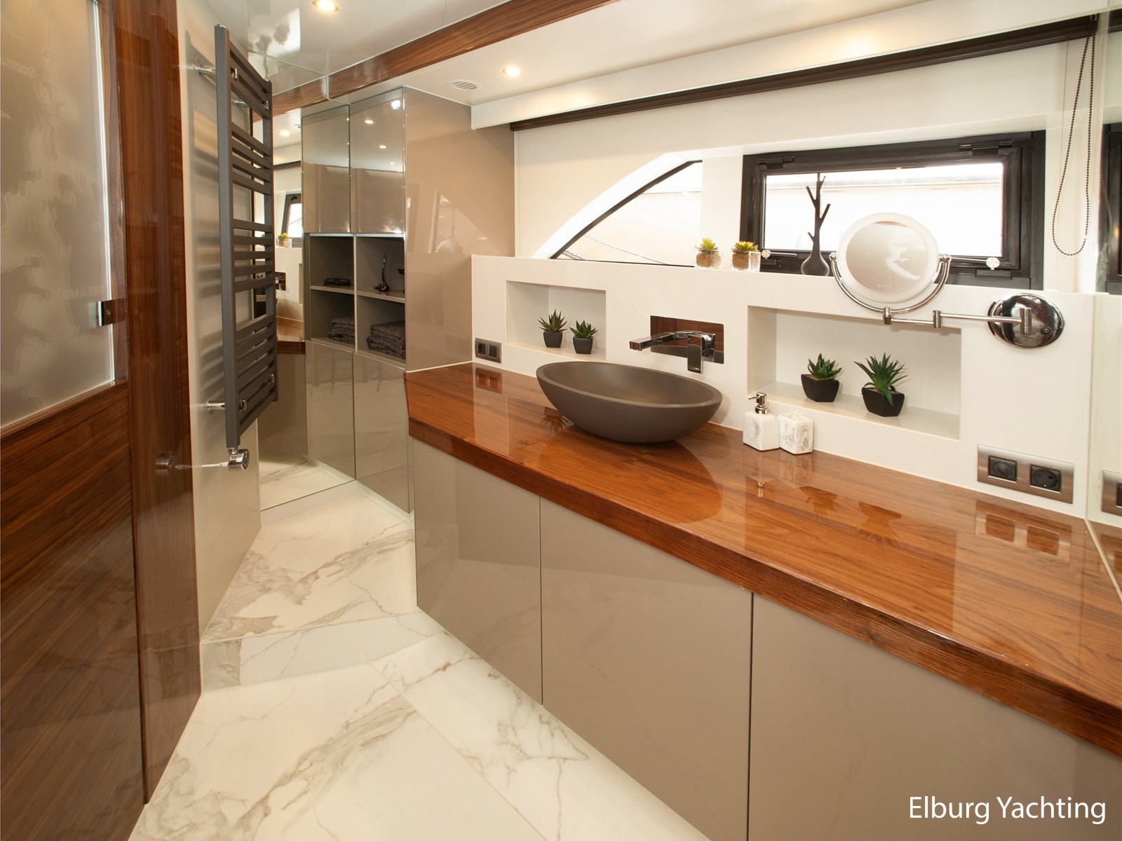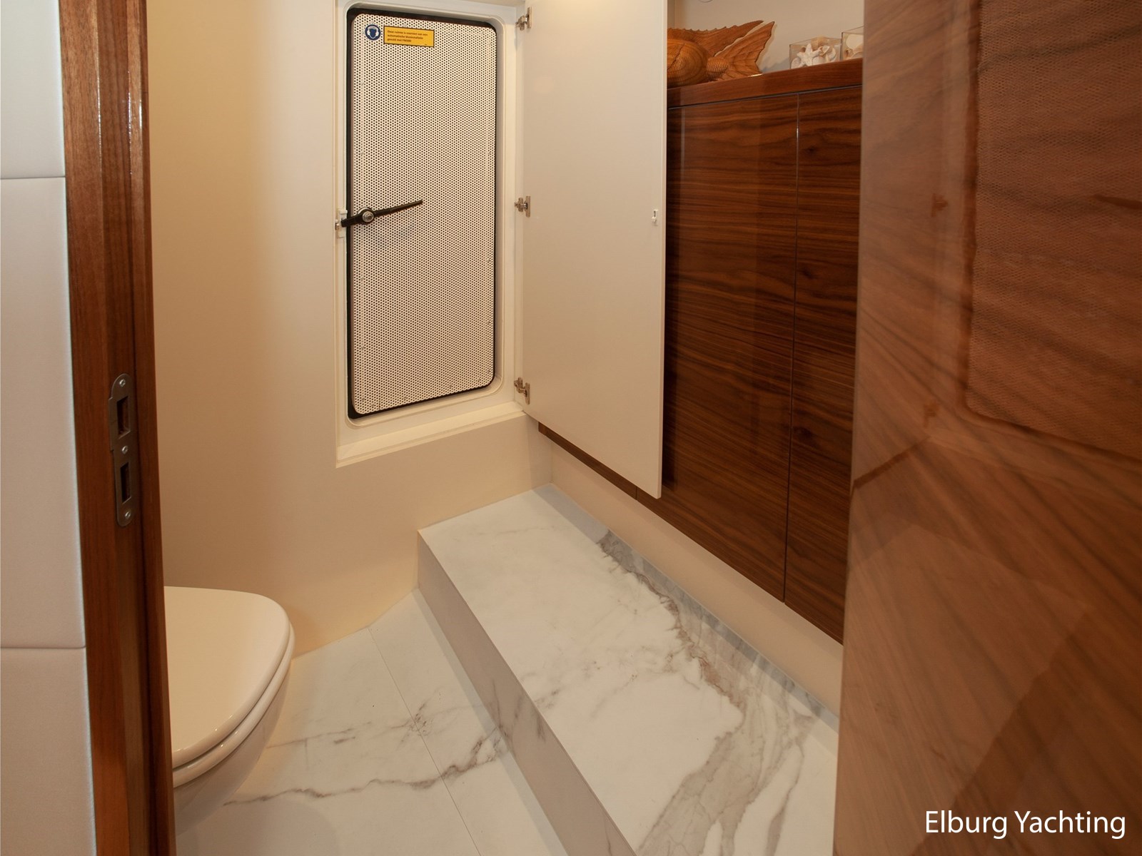 The deck-level saloon offers spectacular 360-degree views, enhancing the sense of space and light through the large windows. Wide sidedecks all around make it safe and easy to move around on a single level. The foredeck offers ample space for lounging, complete with a comfortable sofa for enjoying the view. The aft deck is also generously sized, with a semi-circular sofa for five people and a covered area providing shade on sunny days. Stylish stairs on both sides of the yacht lead to the spacious bathing platform, which also provides access to the professionally equipped engine room with good headroom. You'll enjoy a daily inspection here and see at one glance that all the technology is in working order. This vessel holds a valid CVO certificate.
