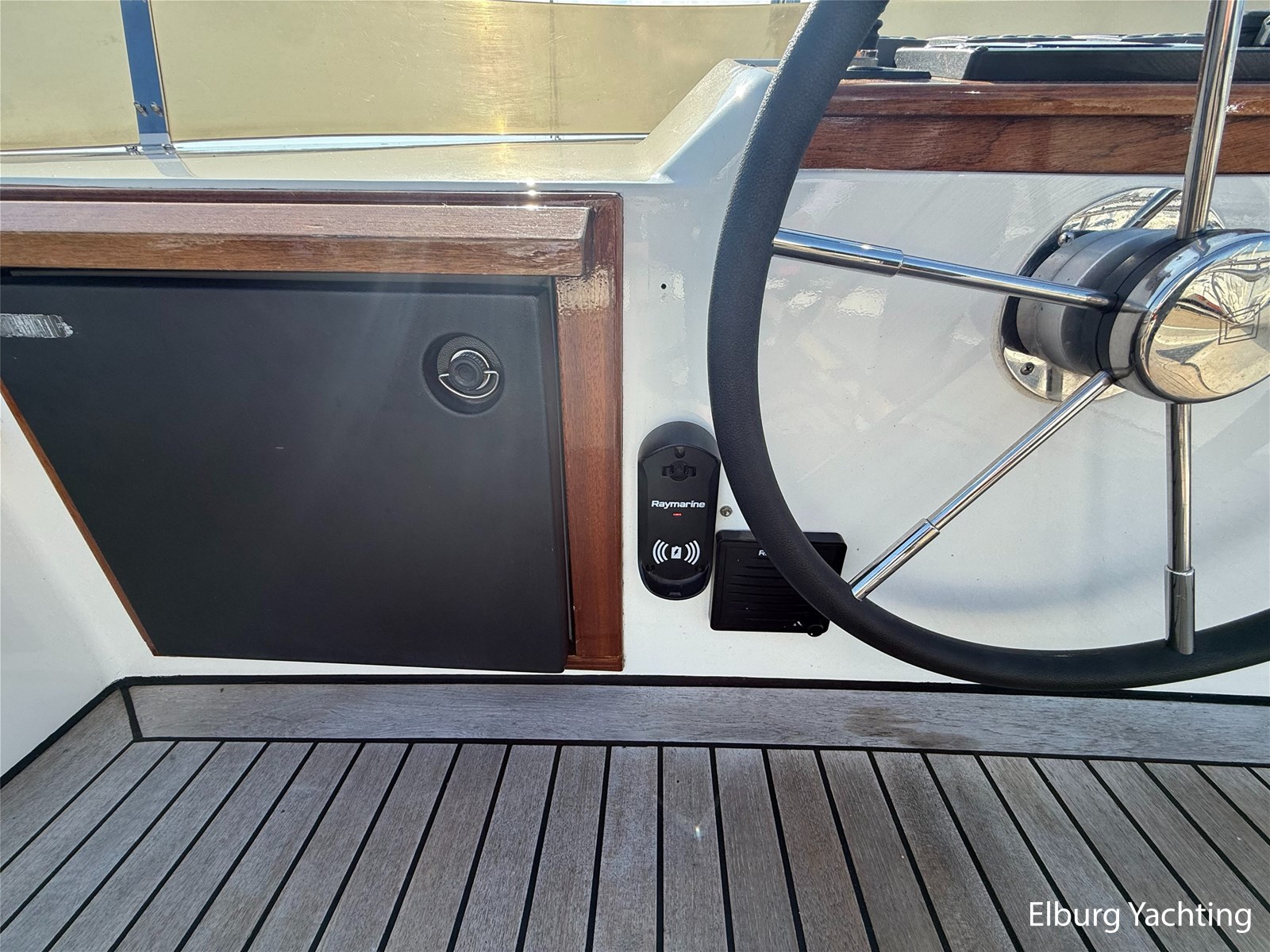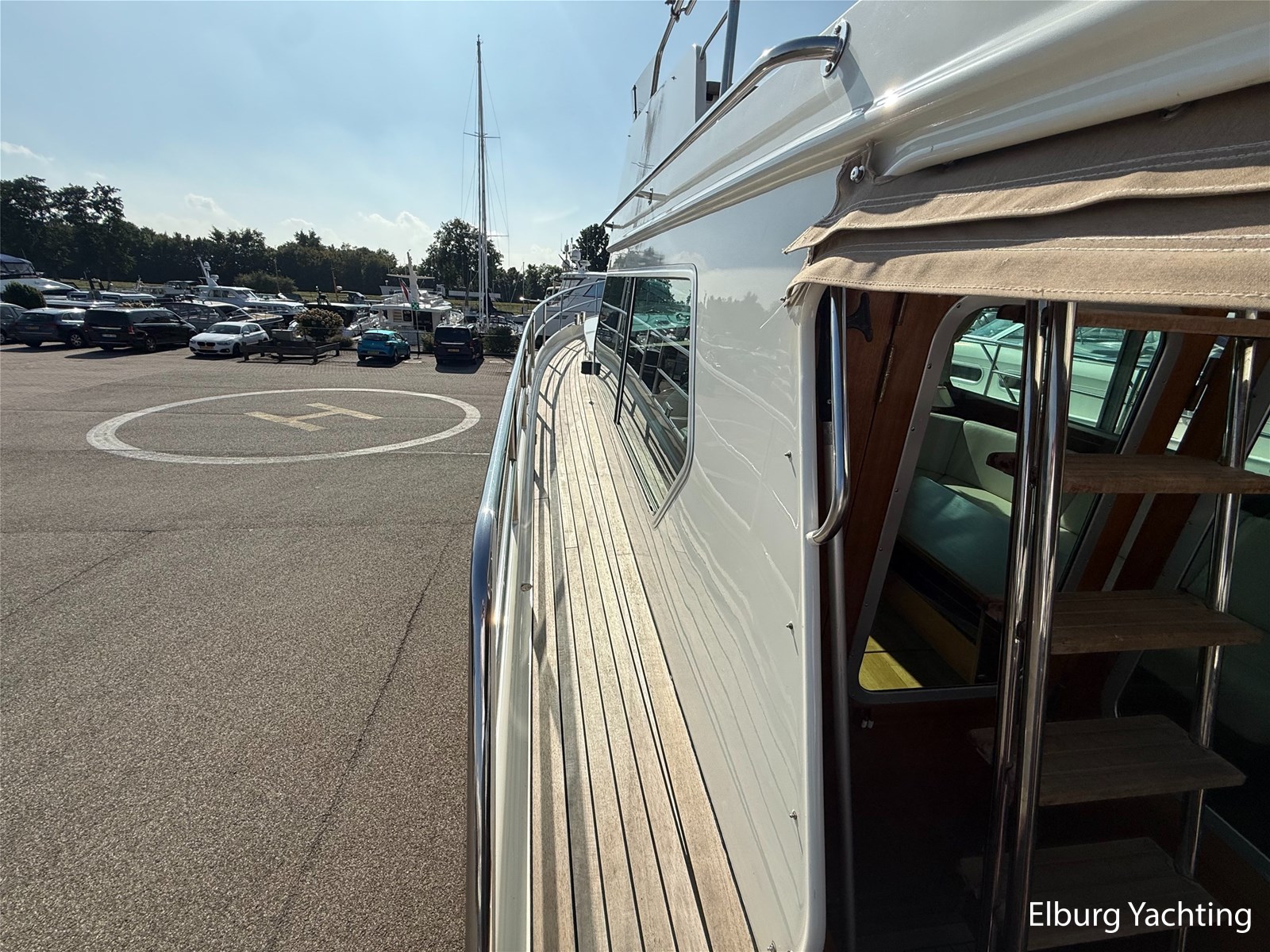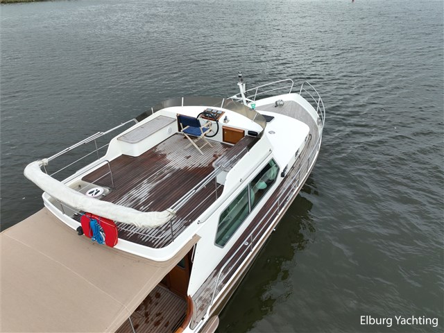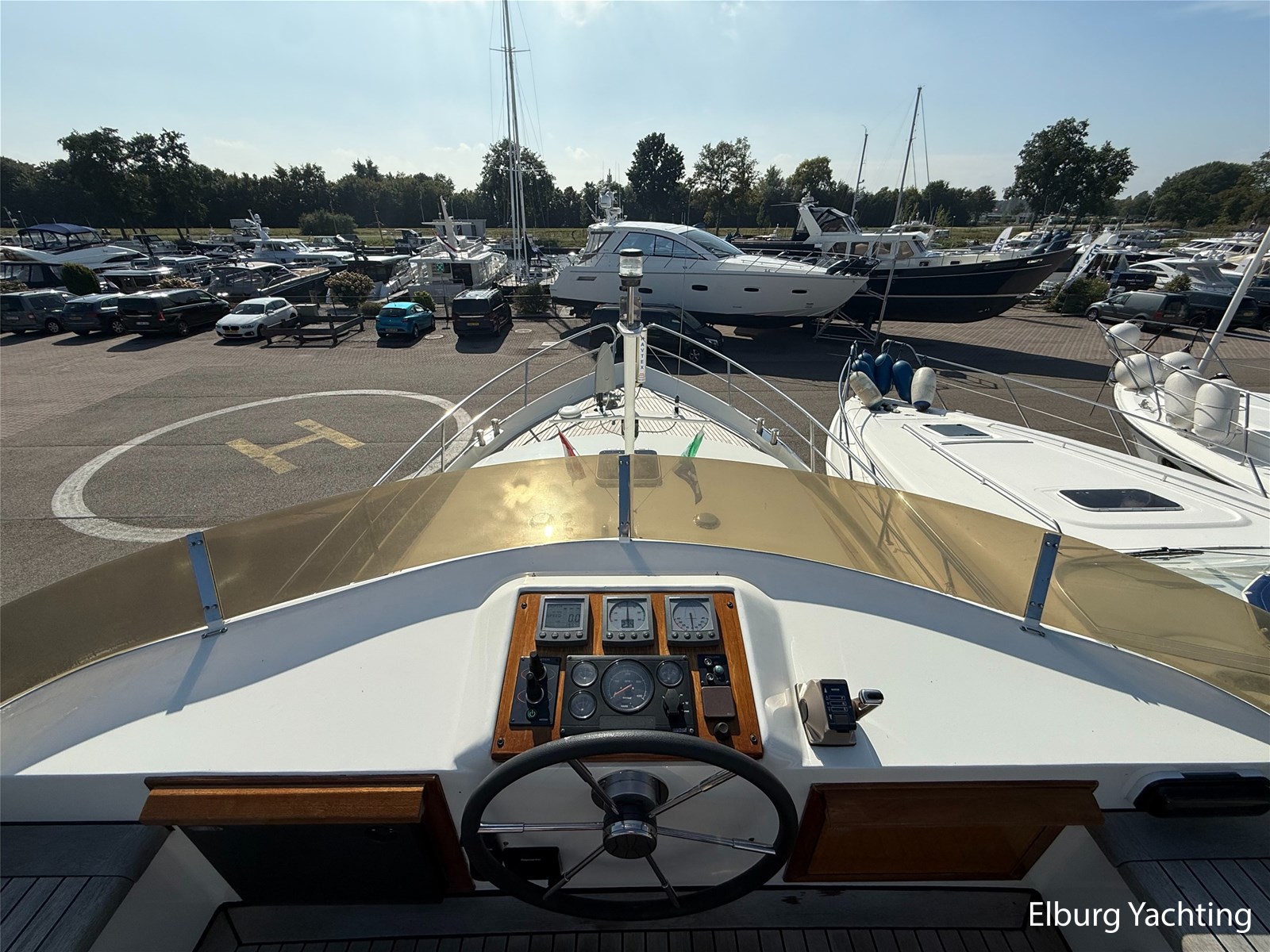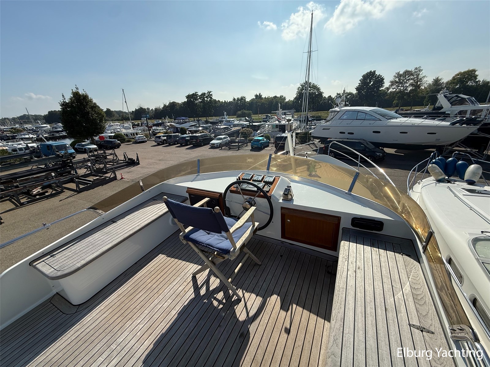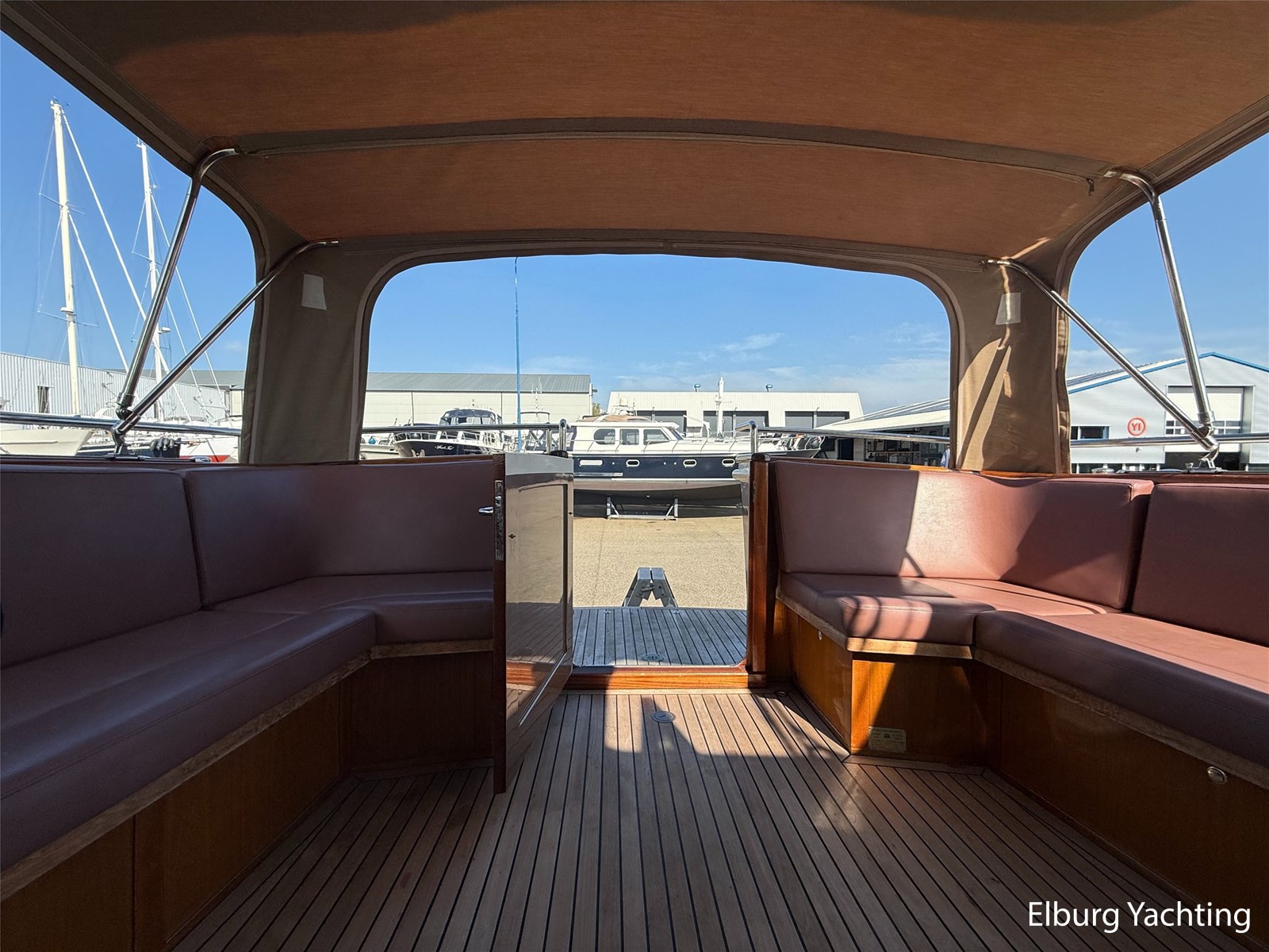 De Pikmeerkruiser 12.50 Exclusive Flybridge is een stijlvol en compleet uitgerust motorjacht met een aantrekkelijke indeling en praktische vaareigenschappen. Het schip beschikt over een royaal zwemplateau met spiegeldeur, dat direct toegang biedt tot de ruime open kuip. Deze kuip is afsluitbaar en dankzij openslaande deuren naadloos verbonden met de salon, waardoor een aangename leefruimte ontstaat. De salon is voorzien van een klassiek scheepsinterieur met mahoniehouten afwerking, een houten vloer en recent geplaatste premium gordijnen. Middels twee trappen naar beneden komt u vanuit de salon in de open kombuis, waar zich tevens de gescheiden douche- en toiletruimte en een slaapvertrek in het voorschip bevinden. De voorhut is uitgerust met een V-bed, dat eenvoudig omgebouwd kan worden tot een groot tweepersoonsbed. De voortstuwing wordt verzorgd door een 159 pk sterke Vetus Deutz DT-64 6-cilinder dieselmotor. Technisch is het jacht uitgerust met een natte uitlaat, watergesmeerde schroefas (diameter 45 mm), een gesloten koelsysteem, twee roerstandaanwijzers en dubbele elektronische motorbediening. Zowel het motoronderhoud als het onderhoud aan de generator zijn uitgevoerd in 2025. Daarnaast is antifouling aangebracht in 2024. Het jacht beschikt over twee stuurstanden (binnen en op de flybridge), een aluminium klapbare mast en comfortverhogende uitrusting zoals airconditioning, centrale verwarming, een wasmachine, een generator en drie ruitenwissers. De machinekamer is bereikbaar via geïsoleerde vloerluiken in de salon. Aan dek zijn diverse RVS-details toegepast, waaronder een dubbele RVS-reling en een RVS-handrail langs de opbouw, wat zorgt voor een veilige loop rond het gangboord. Het met teak belegd zwemplateau en flybridge draagt bij aan het luxe karakter van dit schip. De flybridge is verder voorzien van een bimini. Met een doorvaarthoogte van circa 3,20 meter, een kruissnelheid van circa 10–12 km/u en een maximumsnelheid van circa 18 km/u is dit motorjacht geschikt voor uiteenlopende vaargebieden, zowel op binnenwateren als voor langere tochten.