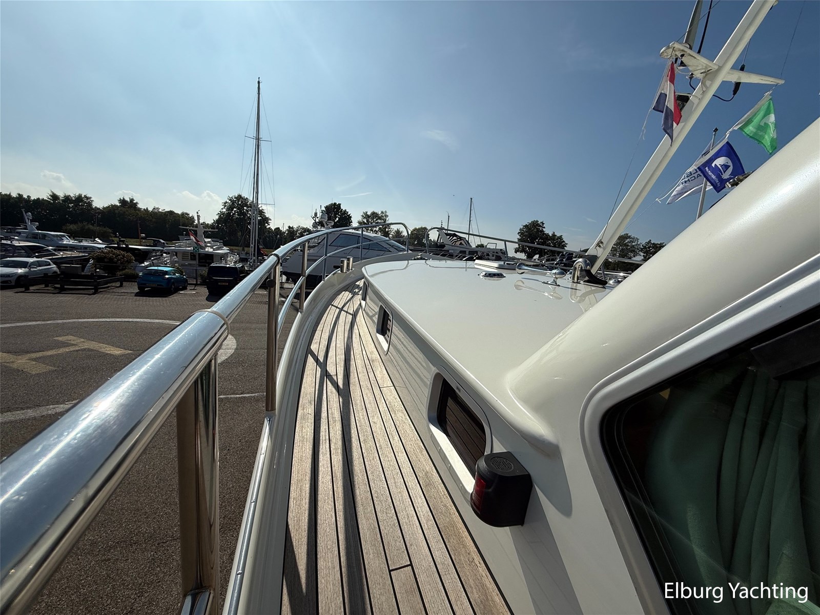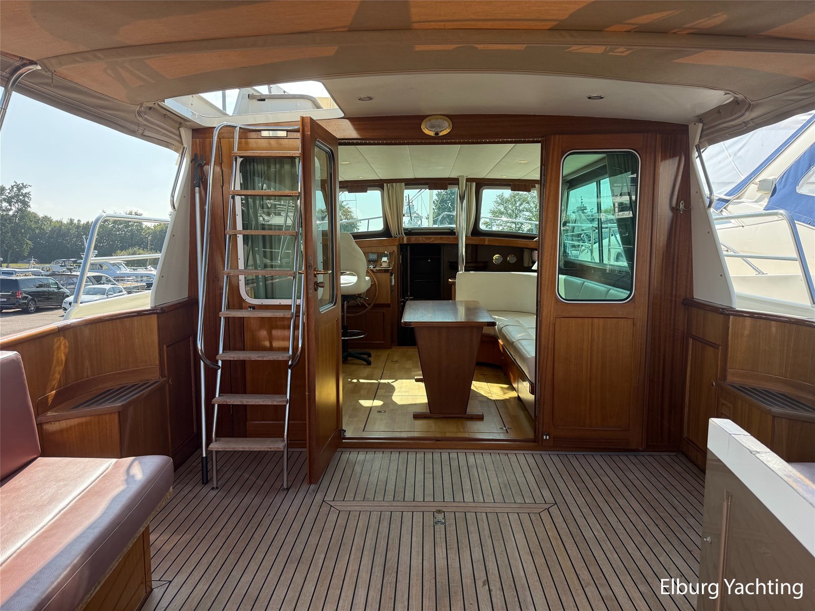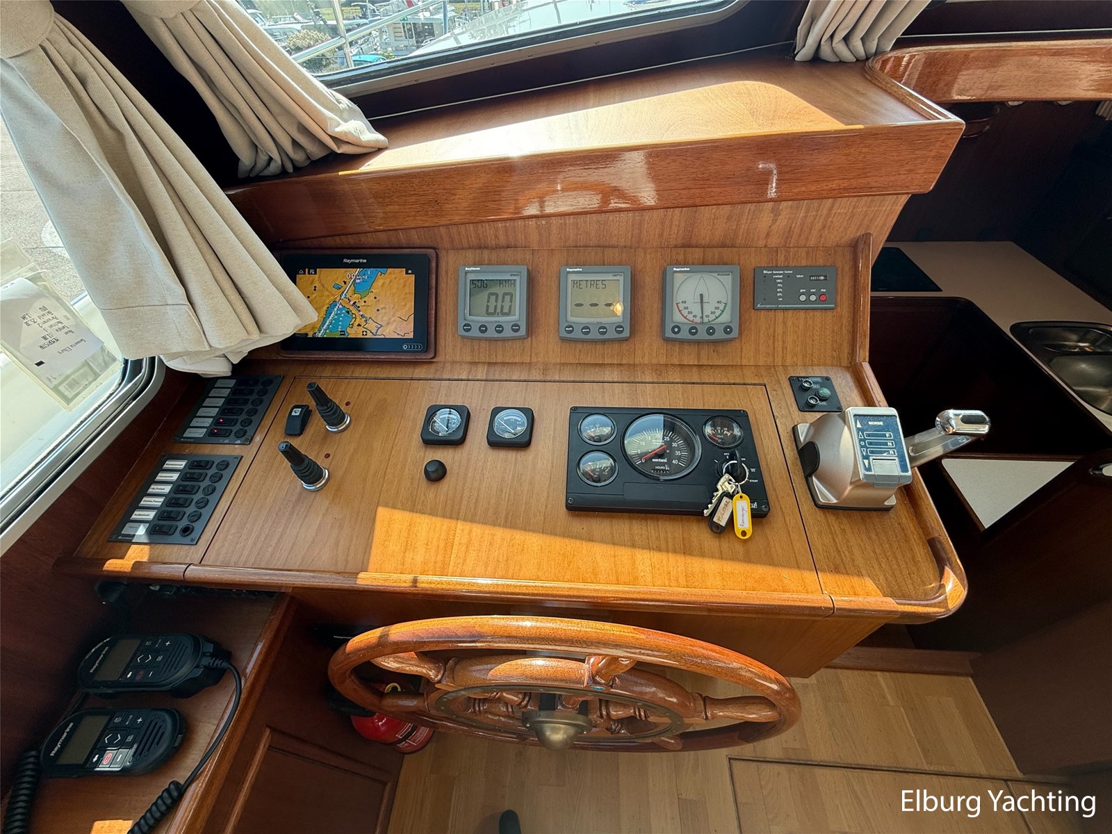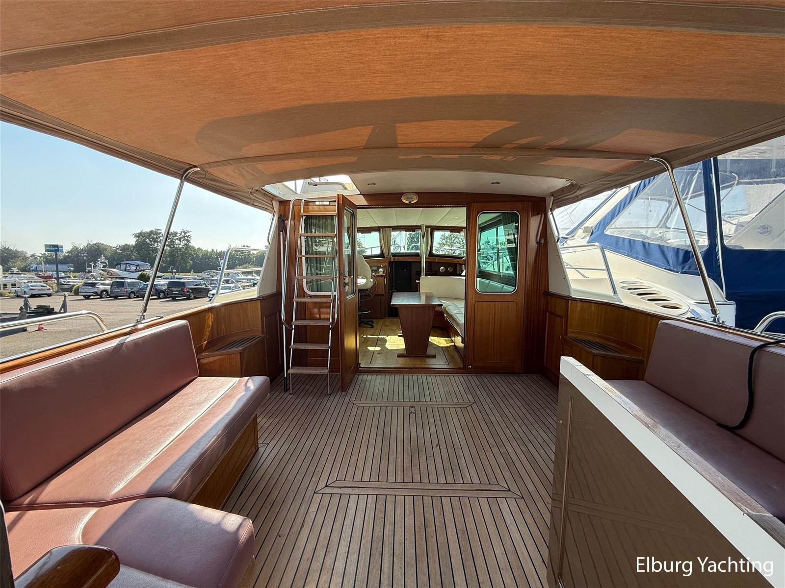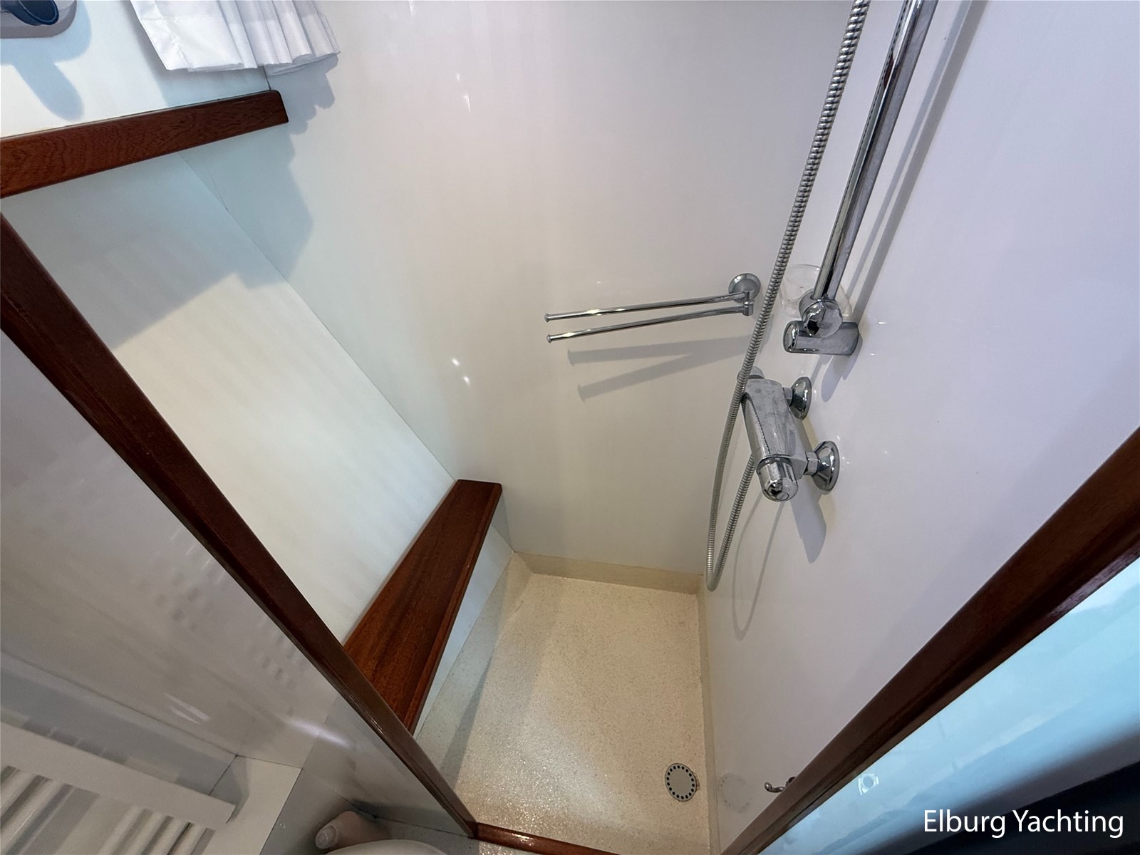 De Pikmeerkruiser 12.50 Exclusive Flybridge is een stijlvol en compleet uitgerust motorjacht met een aantrekkelijke indeling en praktische vaareigenschappen. Het schip beschikt over een royaal zwemplateau met spiegeldeur, dat direct toegang biedt tot de ruime open kuip. Deze kuip is afsluitbaar en dankzij openslaande deuren naadloos verbonden met de salon, waardoor een aangename leefruimte ontstaat. De salon is voorzien van een klassiek scheepsinterieur met mahoniehouten afwerking, een houten vloer en recent geplaatste premium gordijnen. Middels twee trappen naar beneden komt u vanuit de salon in de open kombuis, waar zich tevens de gescheiden douche- en toiletruimte en een slaapvertrek in het voorschip bevinden. De voorhut is uitgerust met een V-bed, dat eenvoudig omgebouwd kan worden tot een groot tweepersoonsbed. De voortstuwing wordt verzorgd door een 159 pk sterke Vetus Deutz DT-64 6-cilinder dieselmotor. Technisch is het jacht uitgerust met een natte uitlaat, watergesmeerde schroefas (diameter 45 mm), een gesloten koelsysteem, twee roerstandaanwijzers en dubbele elektronische motorbediening. Zowel het motoronderhoud als het onderhoud aan de generator zijn uitgevoerd in 2025. Daarnaast is antifouling aangebracht in 2024. Het jacht beschikt over twee stuurstanden (binnen en op de flybridge), een aluminium klapbare mast en comfortverhogende uitrusting zoals airconditioning, centrale verwarming, een wasmachine, een generator en drie ruitenwissers. De machinekamer is bereikbaar via geïsoleerde vloerluiken in de salon. Aan dek zijn diverse RVS-details toegepast, waaronder een dubbele RVS-reling en een RVS-handrail langs de opbouw, wat zorgt voor een veilige loop rond het gangboord. Het met teak belegd zwemplateau en flybridge draagt bij aan het luxe karakter van dit schip. De flybridge is verder voorzien van een bimini. Met een doorvaarthoogte van circa 3,20 meter, een kruissnelheid van circa 10–12 km/u en een maximumsnelheid van circa 18 km/u is dit motorjacht geschikt voor uiteenlopende vaargebieden, zowel op binnenwateren als voor langere tochten.