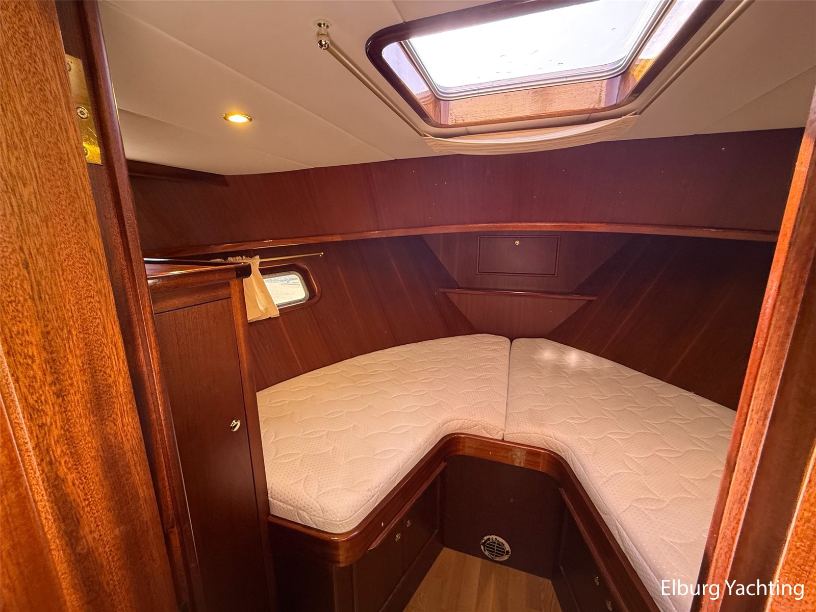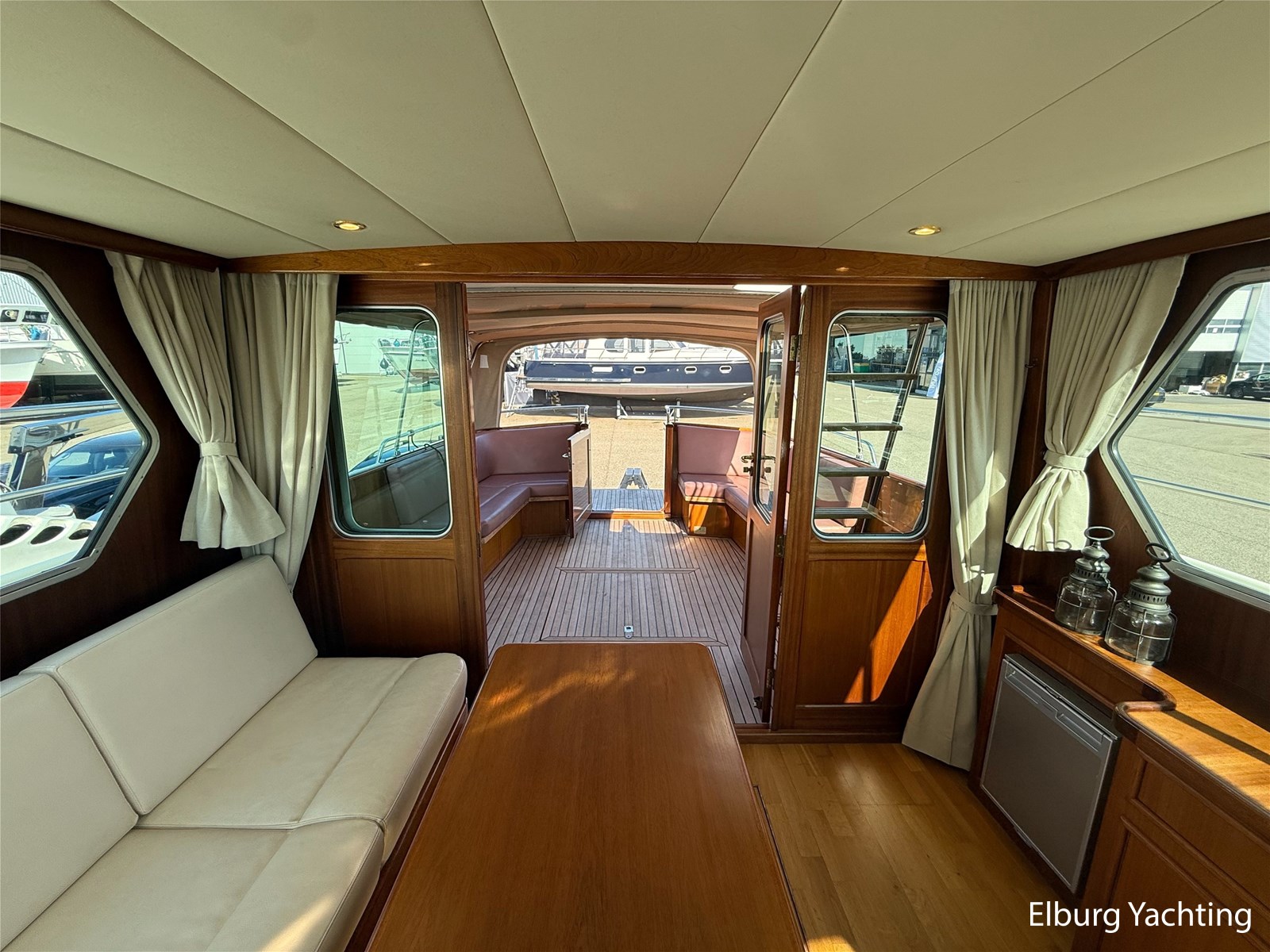 - Licht scheepsinterieur + Beige bekleding in salon en bordeaux rode bekleding op banken in kuip