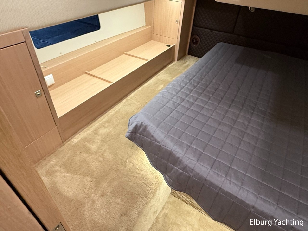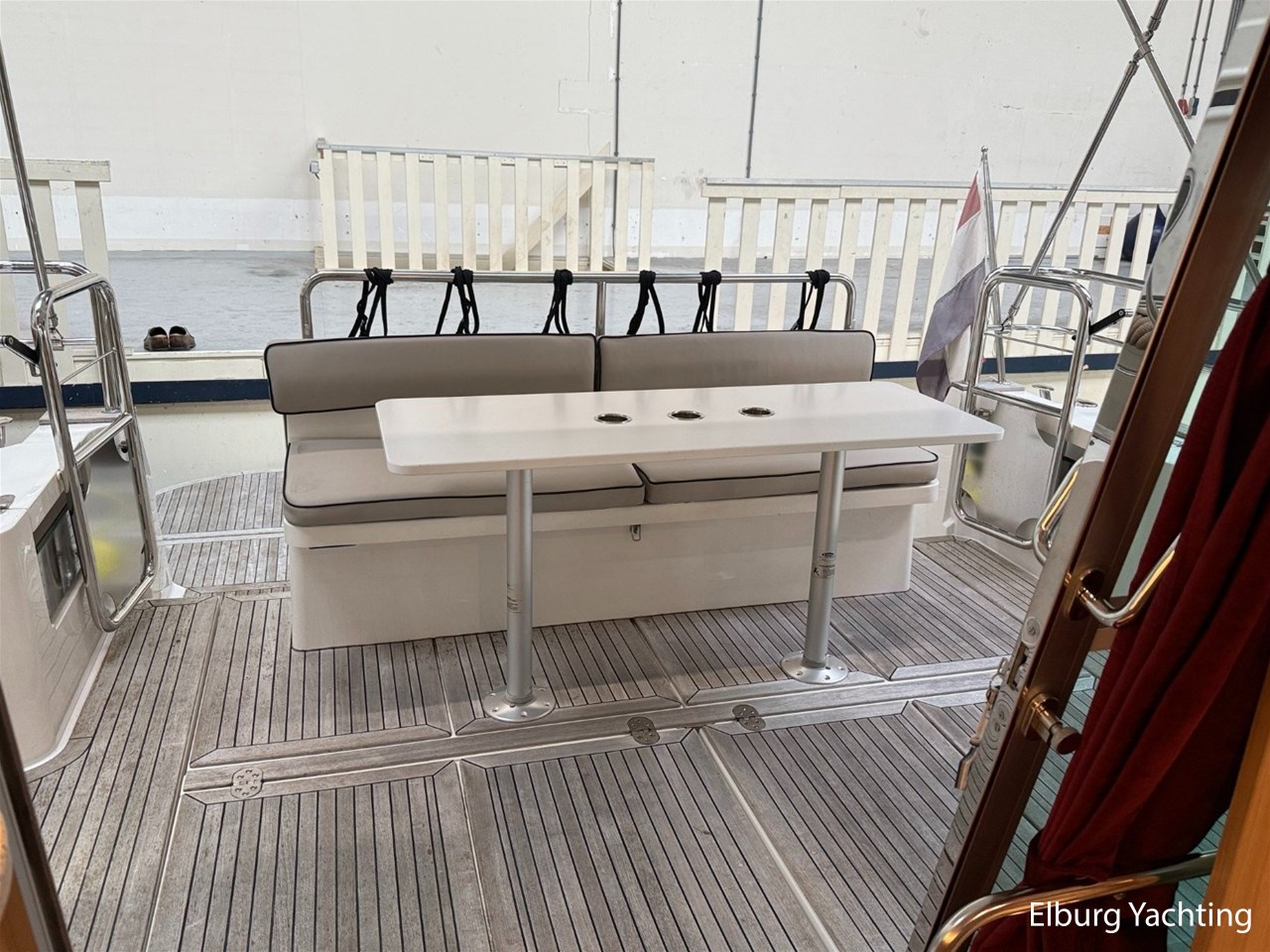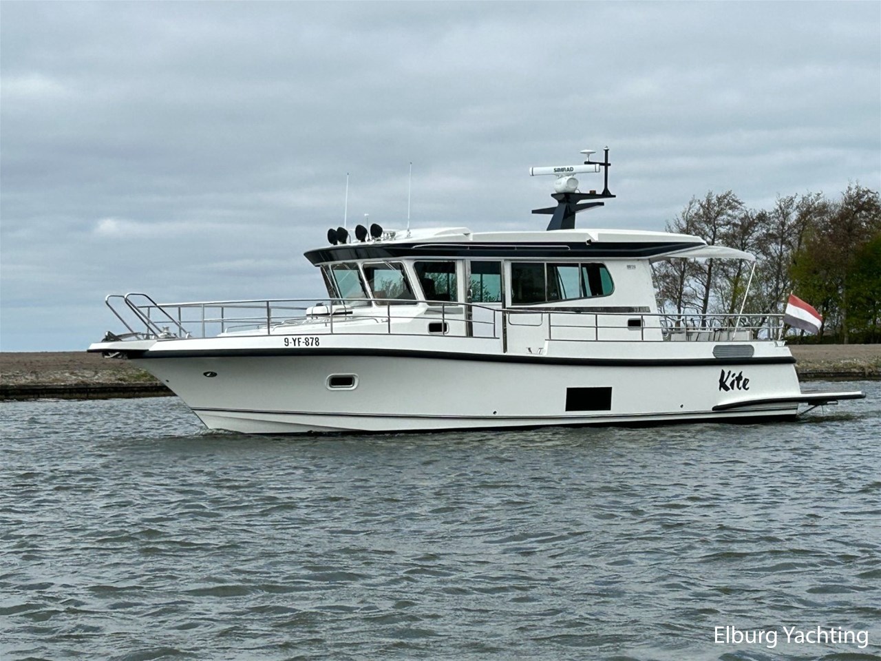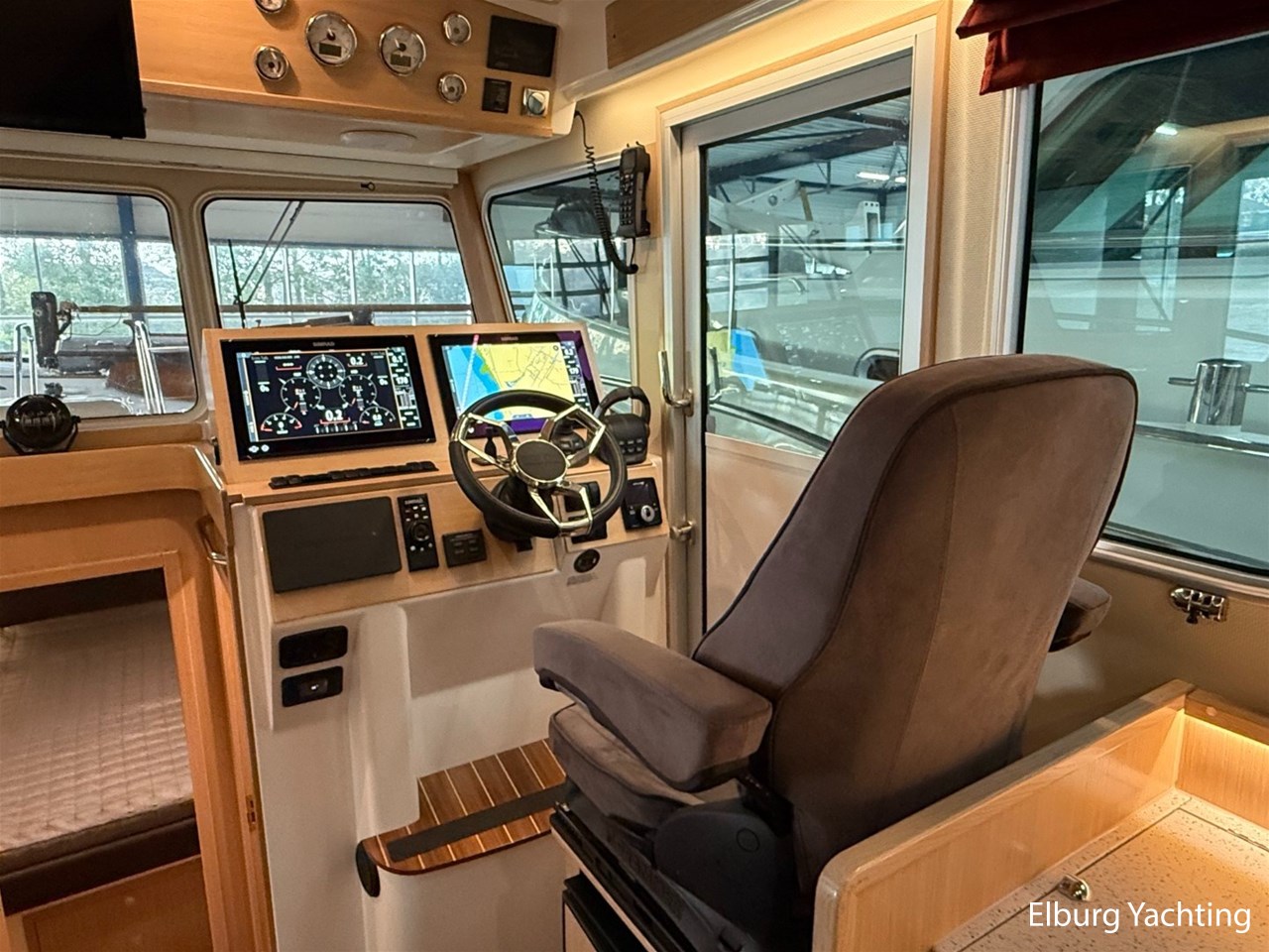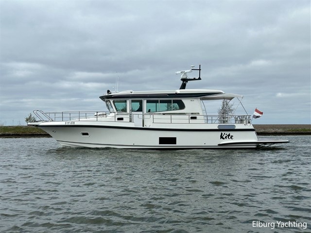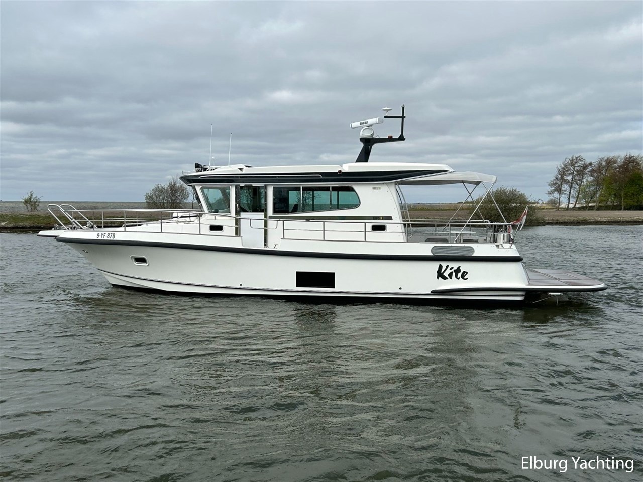 Sporty and highly seaworthy Nord Star Patrol 42 offered by its first owner. This fully equipped Scandinavian Nord Star is a true quality yacht with luxurious features. Among other things, she is equipped with a teak deck all around + swimming platform with double stainless steel guardrails with railings, fender holders, electric sunroof and large spotlights on the wheelhouse. With seaworthiness in mind, the wheelhouse is equipped with negative windscreen angles, allowing spray to fall downwards in rough seas and thus ensuring good visibility. The wheelhouse is easily accessible from the spacious open cockpit with fixed bench, cockpit tent and cosy cockpit table via the stainless steel sliding doors. The wheelhouse is very efficiently laid out, with a spacious and, above all, very cosy dinette with a lowerable table (which can also be used as a bed), TV + stereo, galley with double sink, induction hob, combi oven and worktop, and, of course, the well-organised helm on the starboard side. The wheelhouse is easily accessible on both sides via the side doors from the gangways, which is very practical when mooring and unmooring. The forward cabin is equipped with a beautiful freestanding double bed and nearby sanitary facilities (separate toilet and shower). The aft cabin is accessible from the rear of the wheelhouse and has a spacious double bed amidships and a nearby toilet with washbasin.