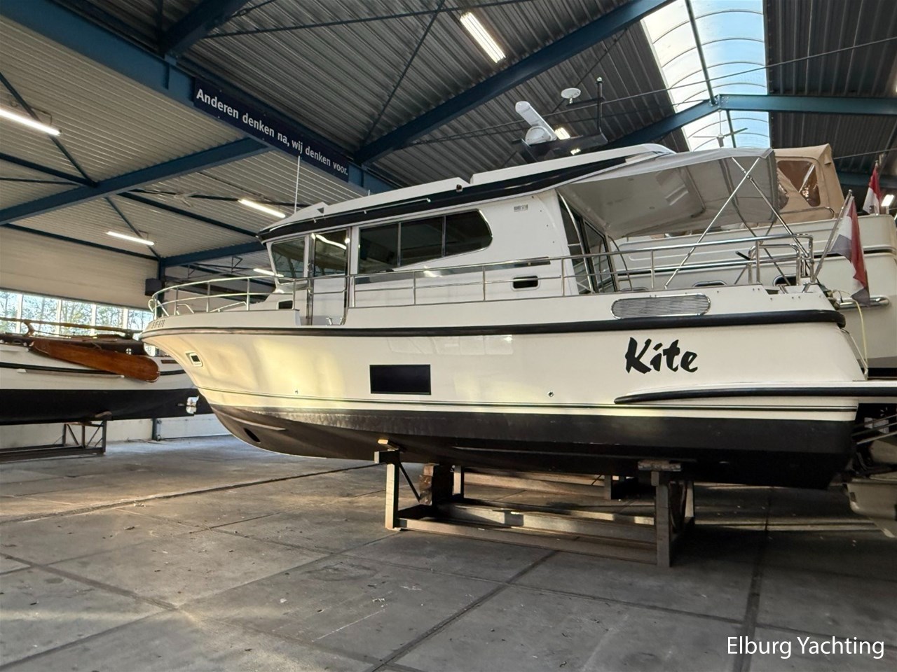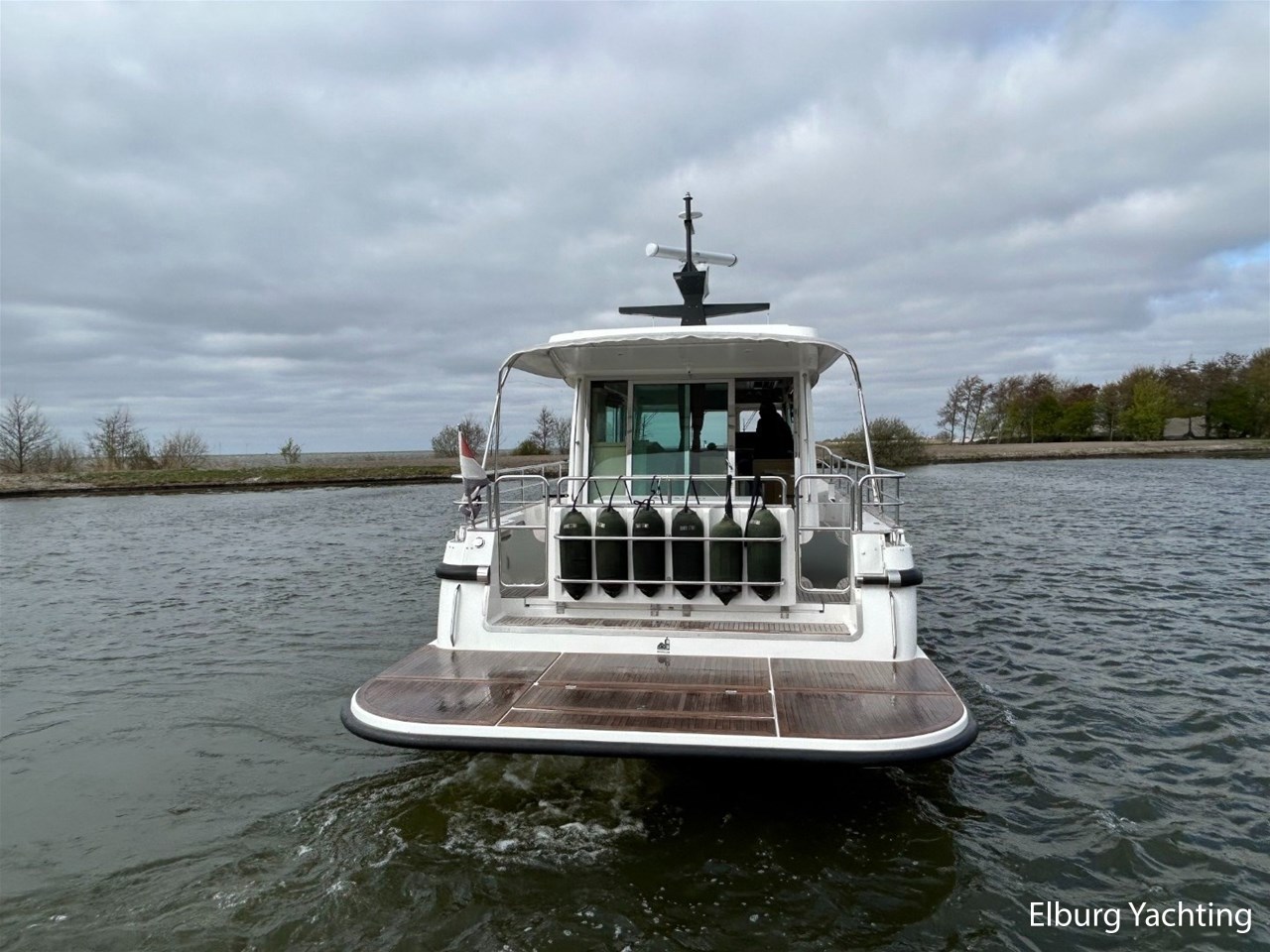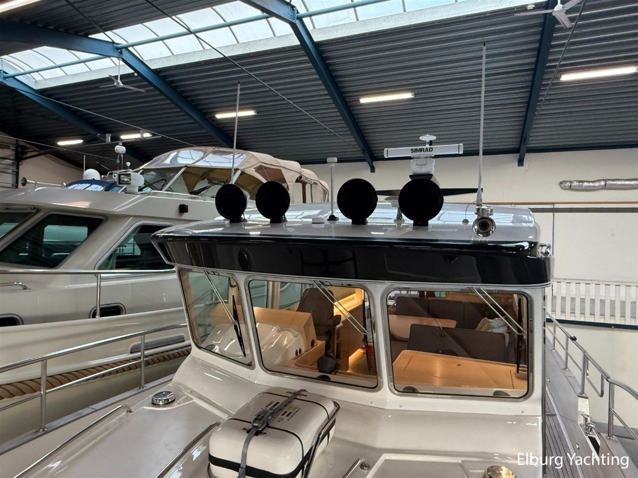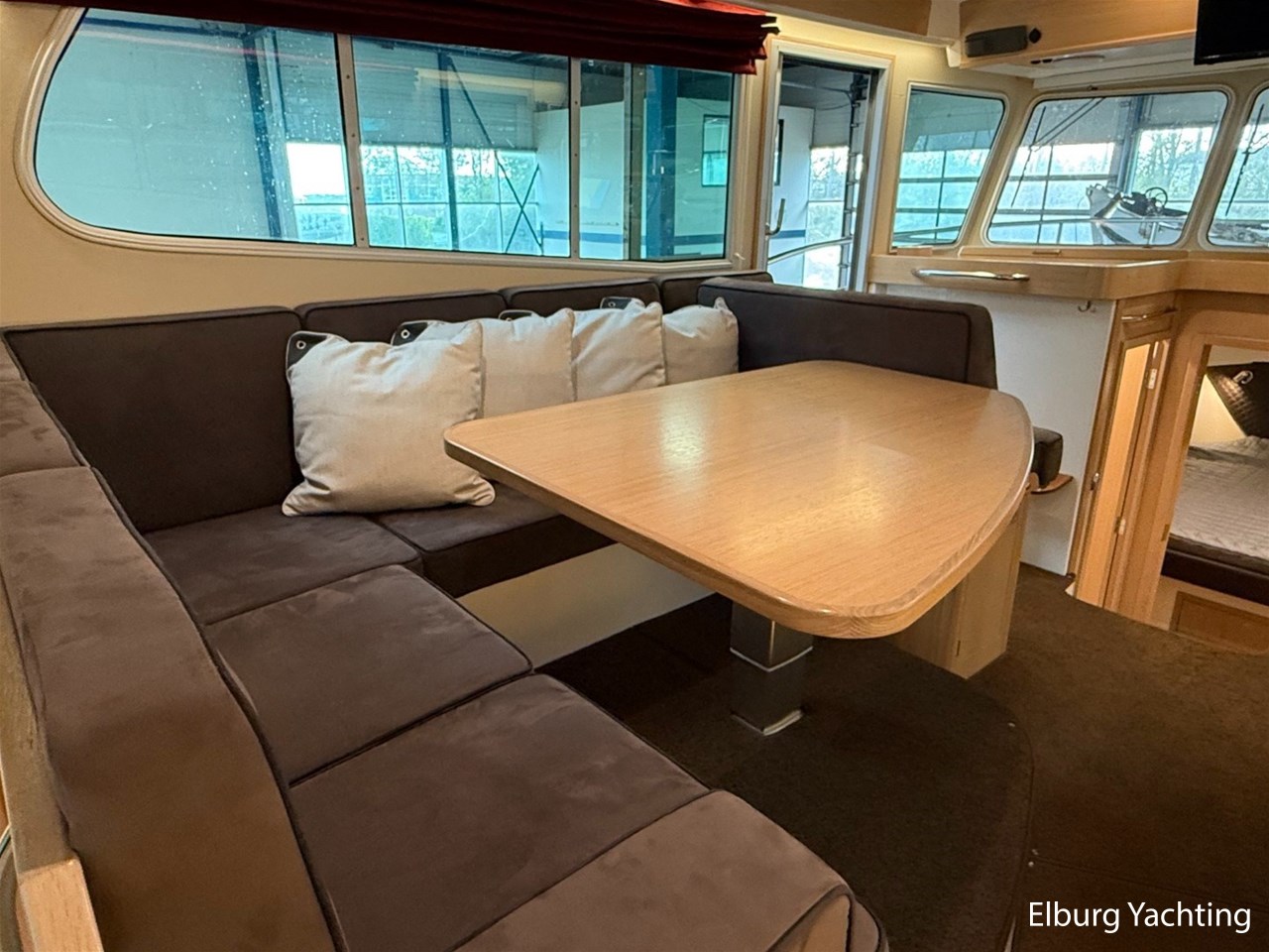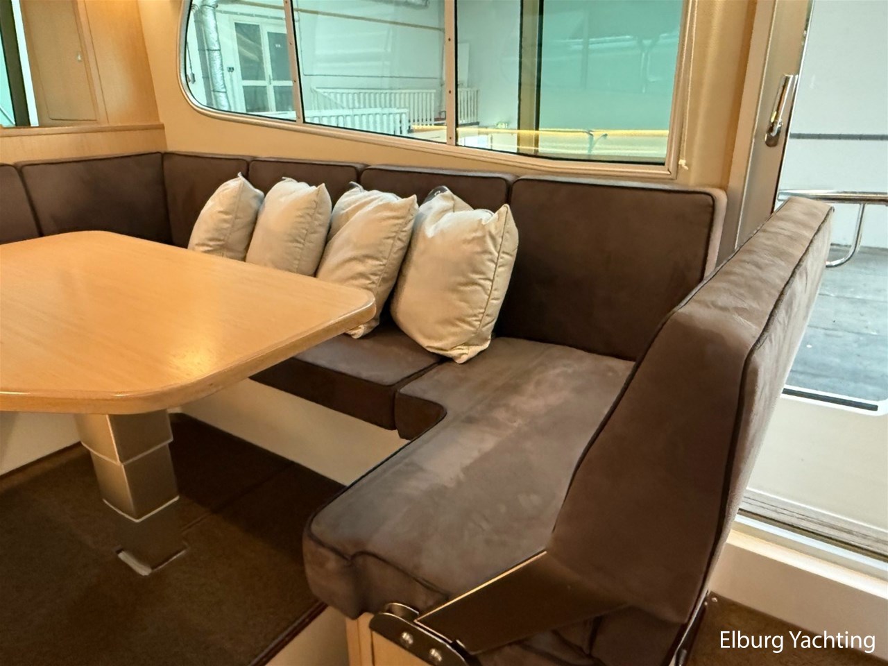 Sporty and highly seaworthy Nord Star Patrol 42 offered by its first owner. This fully equipped Scandinavian Nord Star is a true quality yacht with luxurious features. Among other things, she is equipped with a teak deck all around + swimming platform with double stainless steel guardrails with railings, fender holders, electric sunroof and large spotlights on the wheelhouse. With seaworthiness in mind, the wheelhouse is equipped with negative windscreen angles, allowing spray to fall downwards in rough seas and thus ensuring good visibility. The wheelhouse is easily accessible from the spacious open cockpit with fixed bench, cockpit tent and cosy cockpit table via the stainless steel sliding doors. The wheelhouse is very efficiently laid out, with a spacious and, above all, very cosy dinette with a lowerable table (which can also be used as a bed), TV + stereo, galley with double sink, induction hob, combi oven and worktop, and, of course, the well-organised helm on the starboard side. The wheelhouse is easily accessible on both sides via the side doors from the gangways, which is very practical when mooring and unmooring. The forward cabin is equipped with a beautiful freestanding double bed and nearby sanitary facilities (separate toilet and shower). The aft cabin is accessible from the rear of the wheelhouse and has a spacious double bed amidships and a nearby toilet with washbasin.